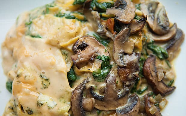 Puis ajoutez les champignons et épinards avec le reste de la crème et remuez.