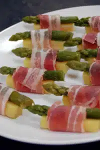 Déposez une asperge sur chaque pomme de terre puis enroulez le tout d’une tranche de lard. Faites dorer les sushis dans le reste du beurre sur toutes les faces. Servez aussitôt….. Bon appétit !