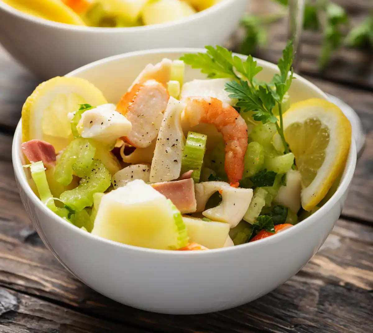 Ce plat raffiné, une idée de recette fraîche, la salade de pommes de terre fruits de mer et céleri idéale pour les amateurs de fruits de mer.