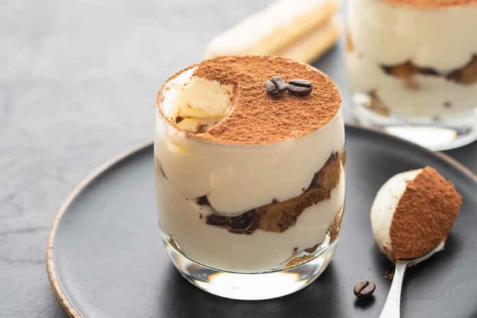 Dessert italien classique, le tiramisu se compose traditionnellement de couches des biscuits imbibés de café et d’un mélange de mascarpone et d’œufs.
